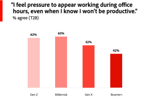 According to Adobe, about 62% of Gen Z workers and 63% of millennial workers feel as if they need to be in the office during specific hours, such as 9 to 6. However, many of these younger employees feel more productive at later hours and favor jobs that allow them to work at those times.